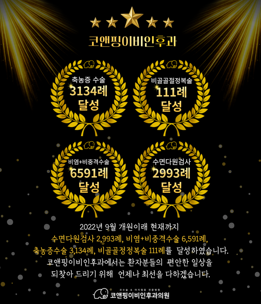 2022년 9월 개원이래 현재까지 수면다원검사 2993례, 비염+비중격 수술 6591례, 축농증 수술 3134례, 비골골절정복술 111례를 달성하였습니다.