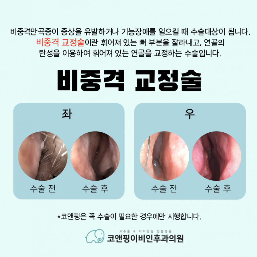 비중격만곡증이 증상을 유발하거나 기능장애를 일으킬 때 수술대상이 됩니다.