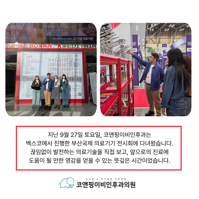 지난 9월 27일 토요일, 코앤핑이비인후과는 벡스코에서 진행한 부산국제 의료기기 전시회에 다녀왔습니다. 끊임없이 발전하는 의료기술을 직접 보고, 앞으로의 진료에 도움이 될 만한 영감을 얻을 수 있는 뜻깊은 시간이었습니다.