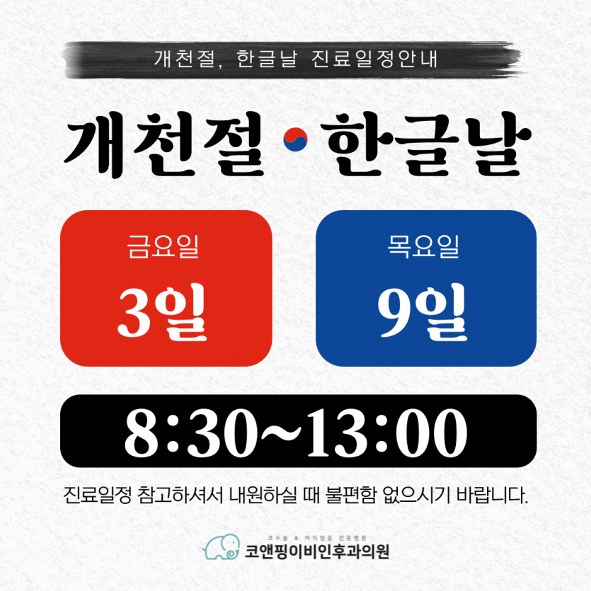 ★ 10월 3일 개천절, 10월 9일 한글날 8시 30분~1시 진료합니다★