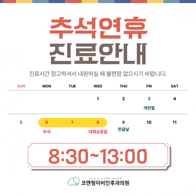 ★ 10월 6일~8일 추석연휴 8시 30분~1시 진료합니다★