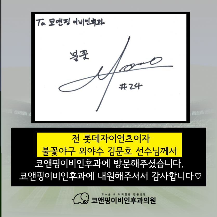 전 롯데자이언츠이자 현 불꽃야구 외야수 김문호 선수님께서 코앤핑이비인후과에 방문해주셨습니다.