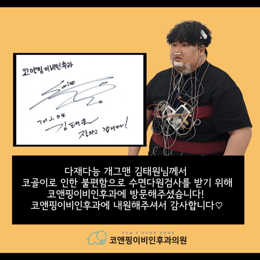 다재다능! 긍정에너지 폭발! 개그맨 김태원님께서 코골이로 인한 불편함으로 수면다원검사를 받기 위해 코앤핑이비인후과에 방문해주셨습니다!
