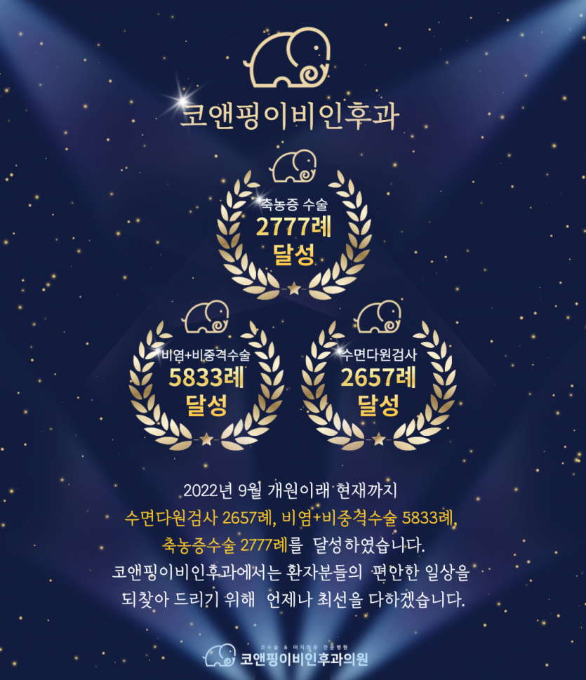 2022년 9월 개원이래 현재까지 수면다원검사 2657례, 비염+비중격 수술 5833례, 축농증 수술 2777례를 달성하였습니다.