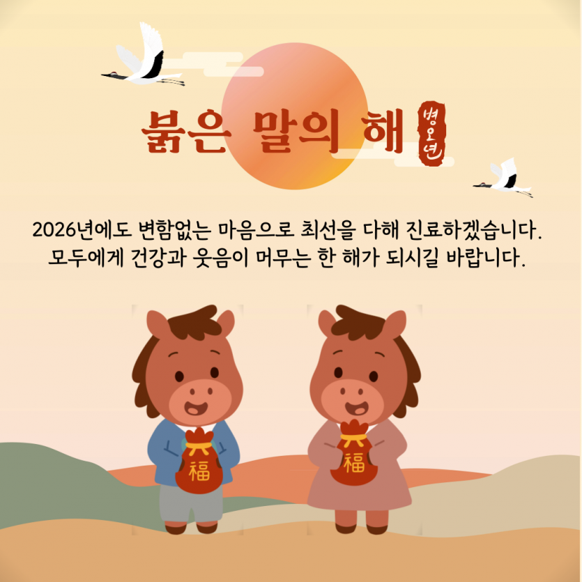 2026년 병오년 붉은 말의 해가 떴습니다. 환자와 직원 모두가 행복한 병원, 코앤핑이비인후과는 2026년에도 변함없는 마음으로 최선을 다해 진료하겠습니다. 모두에게 건강과 웃음이 머무는 한 해가 되시길 바랍니다.