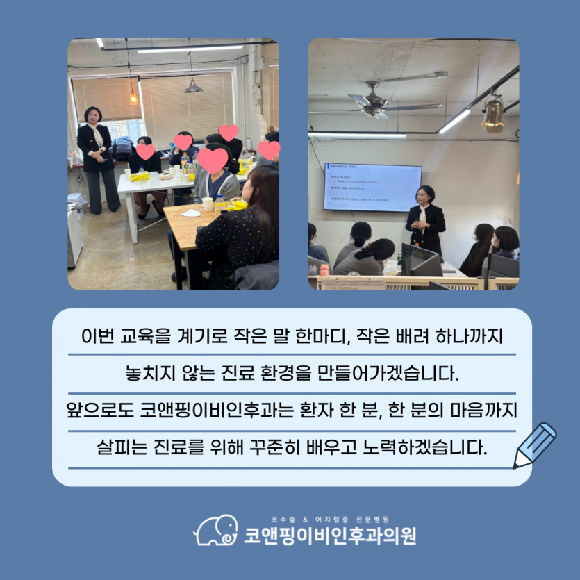 이번 교육을 계기로 작은 말 한마디, 작은 배려 하나까지 놓치지 않는 진료 환경을 만들어가겠습니다. 앞으로도 코앤핑이비인후과는 환자 한 분, 한 분의 마음까지 살피는 진료를 위해 꾸준히 배우고 노력하겠습니다.