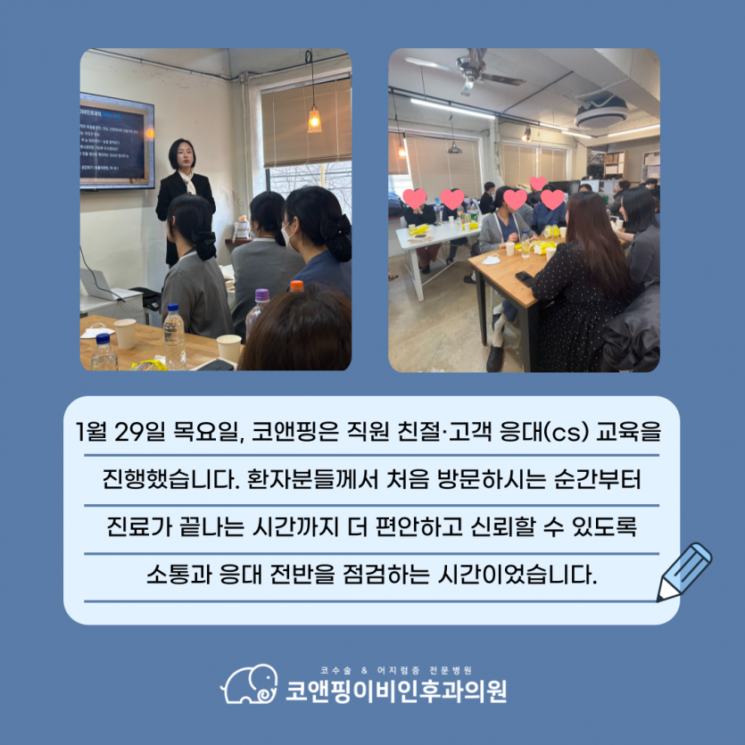 1월 29일 목요일, 코앤핑은 직원 친절·고객 응대 (cs) 교육을 진행했습니다. 환자분들께서 처음 방문하시는 순간부터 진료가 끝나는 시간까지 더 편안하고 신뢰할 수 있도록 소통과 응대 전반을 점검하는 시간이었습니다.